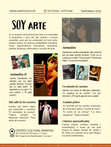 "SOY ARTE" es un proyecto sociocultural que lleva a la comunidad educativa de Lima norte, la experiencia y goce del arte escénico a precios accesibles, para que los estudiantes puedan conocer las diversas posibilidades narrativas, líricas, argumentativas, descriptivas, expositivas, gráficas, históricas, informativas y sociales del arte. Informes al 987722183 -947517685 |